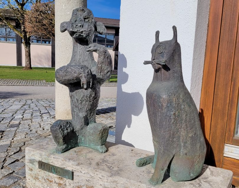 Hund und Katze in perfekter Harmonie – wer dieses „Kunststück“ sehen will, der braucht nur auf den Rathausplatz in Eggstätt zu schauen. Dort, direkt vor dem Haus des Gastes, sind die beiden Figuren „Hund und Katze“ der Eggstätter Künstlerin Christine Stadler angebracht. Streng beobachtet werden die beiden von zwei Bronze-Eulen, die die Künstlerin im Jahr 1960 gefertigt hatte –in Sichtweite ist zudem ihre Installation „Die ersten Europäer“ am Rathaus aufgestelltt.