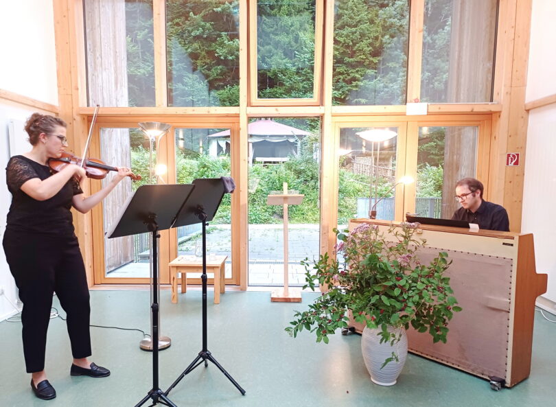 Auch der Leiter des Bergwalderlebniszentrums Thomas Dankemeyer freute sich sehr, dass dieses Konzert mit Hilfe vieler Ehrenamtlicher und Mitarbeiter nun zustande gekommen war und stellte die Arbeit des Waldzentrums kurz vor. Der Veranstaltungsraum, ganz in Holz, hat eine wunderbare Akustik mit Blick aus der großen Fensterfront auf den dunklen Bergwald. Es begann mit Wolfgang Amadeus Mozarts Rondo D-Dur, KV 485, das Monika Schmidt mit kräftigem Saitenstrich temperamentvoll interpretierte, am Klavier kongenial begleitet von Jörg Scholkowski. Es folgten jeweils kurze Stücke, so aus den Vier Jahreszeiten von Antonio Vivaldi „Sommer“ RV 315 und von Gabriel Fauré „Berceuse“, opus 18. Abwechselnd moderierten während des Konzerts die beiden Künstler und gaben Erklärungen zu den verschiedenen Stücken. In der Pause war Gelegenheit, eine kleine geführte Meditiation im Bergwald nahe dem Wildbach der Urschlauer Ache zu erleben, wovon viele Besucher Gebrauch machten. Andere nutzten die Gelegenheit, das liebevoll zubereitete kalte Büffet, kleine Speisen und Getränke zu genießen.