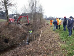 Teilnehmer am Rossgraben BGL Saaldorf-Surheim 2: Berater Andreas Philipp vom Wasserwirtschaftsamt Traunstein steht im Rossgraben. Er dirigiert den Baggerfahrer und zeigt den Teilnehmern des Gewässer-Nachbarschaftstages, wie man eine Sohlgleite im Gewässer anlegen kann