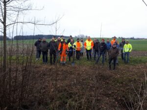 Teilnehmer am Rossgraben BGL Saaldorf-Surheim: Berater Andreas Philipp vom Wasserwirtschaftsamt Traunstein (Bildmitte, mit Schaufel) im Kreis der Teilnehmer des Gewässer-Nachbarschaftstages am Rossgraben in Isselau.
