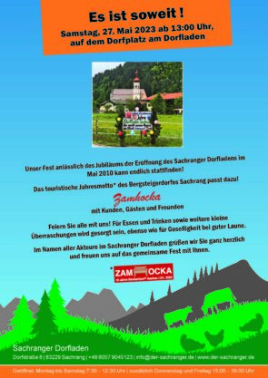 Feiern Sie alle mit uns! Für Essen und Trinken sowie weitere kleine Überraschungen wird gesorgt sein, ebenso wie für Geselligkeit bei guter Laune. m Namen aller Akteure im Sachranger Dorfladen grüßen wir Sie ganz herzlich und freuen uns auf das gemeinsame Fest mit Ihnen”.