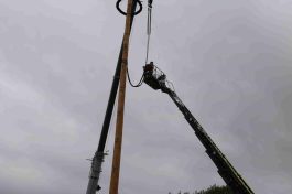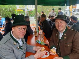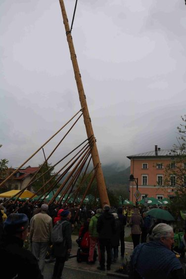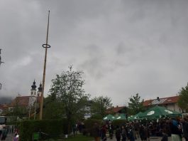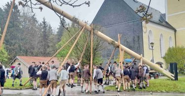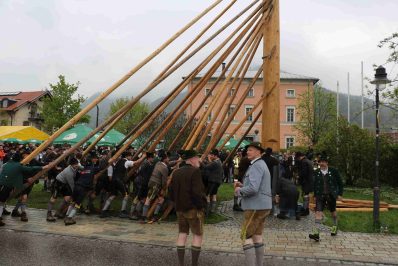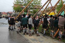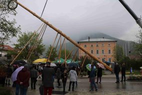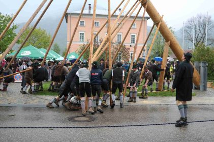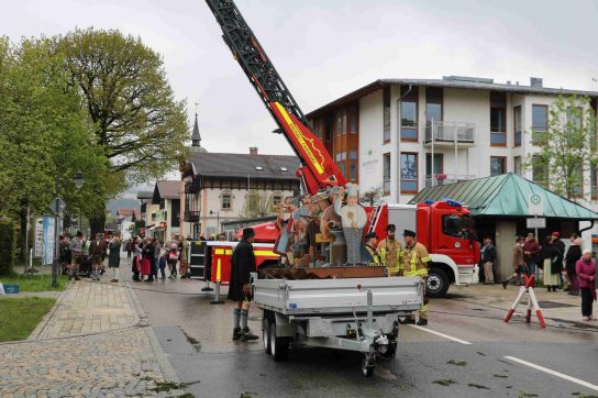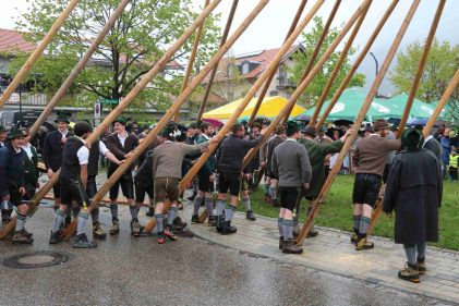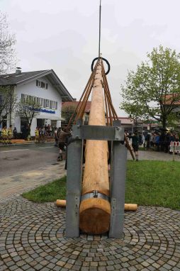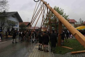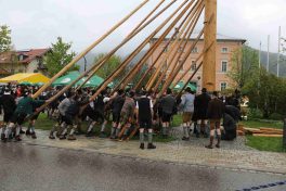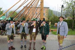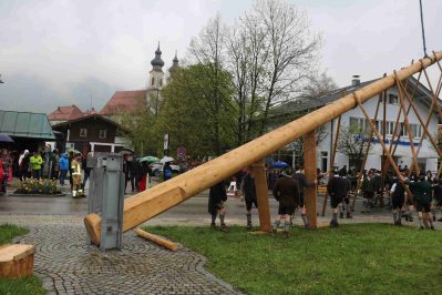 Er ist wieder da: der neue Maibaum am alten Standort am Hans-Clarin-Platz. Die Sachranger waren es, sie hatten den Aschauer Maibaum seit dem Jahresbeginn im Gewahrsam. Fast 70 Männer der drei Trachtenvereine „Griabinga“ Hohenaschau, „Edelweißer“ Niederaschau und „Geiglstoana“ Sachrang stellten den über drei Tonnen schweren, 35 Meter langen Maibaum an seinem Platz vor dem Aschauer Bahnhof auf. Über zwei Stunden harte Arbeit, unter der Leitung von Rudolf Angermaier war notwendig, um den Baumriesen fest in seiner neuen stabilen Halterung zu verankern. Bürgermeister Simon Frank führte die Verhandlungen mit den Maibaumdieben. Für eine Maß Bier und eine Brotzeit waren sie nach der Verhandlung schließlich bereit, den Baum wieder herzugeben und beim Aufstellen mitzuhelfen. Das drohende schlechte Wetter beschleunigte die schwere Arbeit erheblich: beinahe in Rekordzeit brachten die Männer den Baum – gesichert durch einen Autokran – in die Senkrechte und die neuen Maibaumfiguren, gestaltet und bemalt von Alraune und Christian Huba, wurden mit der Drehleiter angebracht. Danach ließen sich alle miteinander das hart verdiente Bier und die Brotzeit schmecken.
