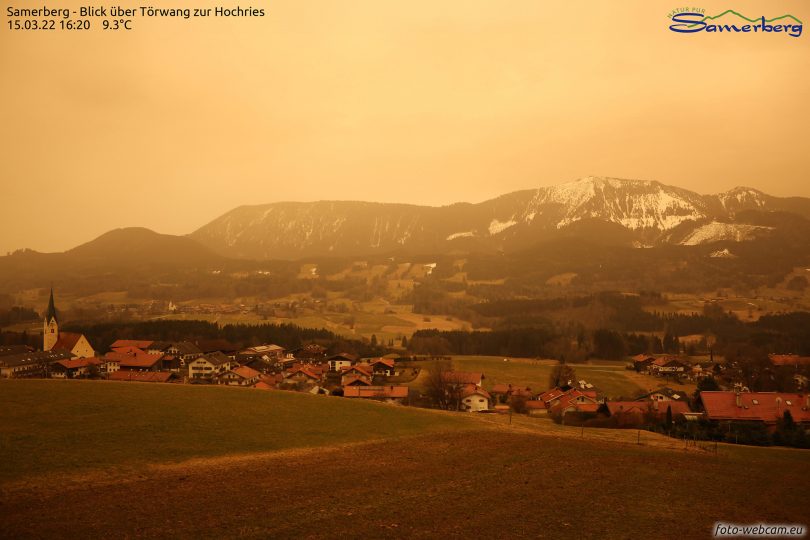 Heute kann der Saharastaub als trüber, gelblicher Schleier am Himmel wahrgenommen werden. In dieser Woche wirbelt ein Tief über Marokko Wüstenstaub aus der Sahara über das Mittelmeer bis nach Europa. Ab Dienstagmittag erreicht der Saharastaub dann auch Süddeutschland. Über den Alpen bleibt der Staub bis Freitag in der Luft hängen. Wird der Saharastaub dann durch Niederschläge ausgewaschen, kann sich Staub auf vorhandenen Schneedecken absetzen und diese gelblich färben.