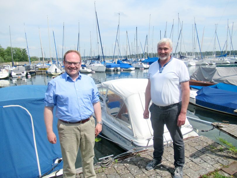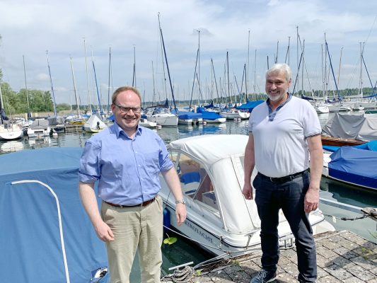 Fotos: Hötzelsperger – Eindrücke vom Sportboothafen Stippelwerft – Bürgermeister Andreas Friedrich (li.) und Chiemsee-Marina-Geschäftsführer Dirk Schröder.