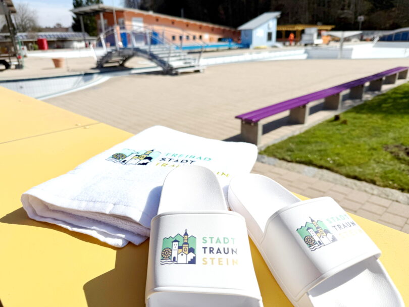 Bericht: Stadt Traunstein – Foto: Marie Mühlthaler – Solange der Vorrat reicht: Wer eine Saisonkarte für das Traunsteiner Freibad oder für die Chiemgauer Bäderwelt kauft, erhält dazu gratis ein Handtuch oder Badeschuhe im Traunstein-Design.