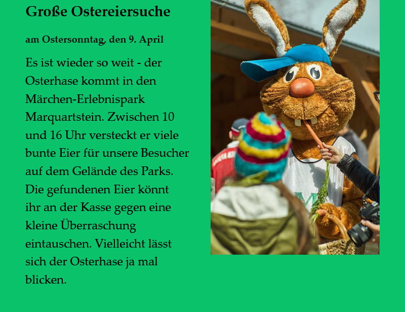 Saisonstart am 1. April! Pünktlich zu Beginn der Osterferien, am Samstag, den 1. April öffnet der Märchen-Erlebnispark Marquartstein wieder täglich von 9:30-18:00 Uhr.