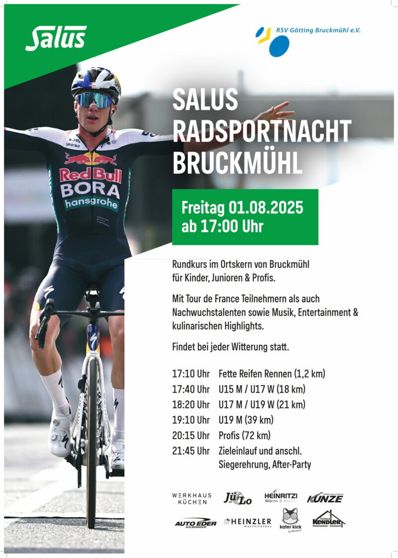 Am Freitag, 1. August verwandelt sich Bruckmühl erneut in ein Zentrum des Radsports: Die Salus Radsportnacht bringt Spitzenathleten und Nachwuchstalente auf den spannenden Rundkurs durch den Ortskern.