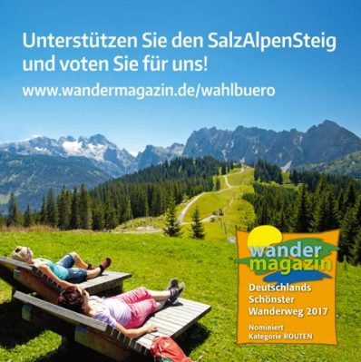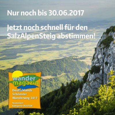 Der SalzAlpenSteig nimmt bei der Wahl zu Deutschlands schönstem Wanderweg teil. Bis spätestens 30. Juni 2017 kann noch online unter www.wandermagazin.de/wahlbuero abgestimmt werden.