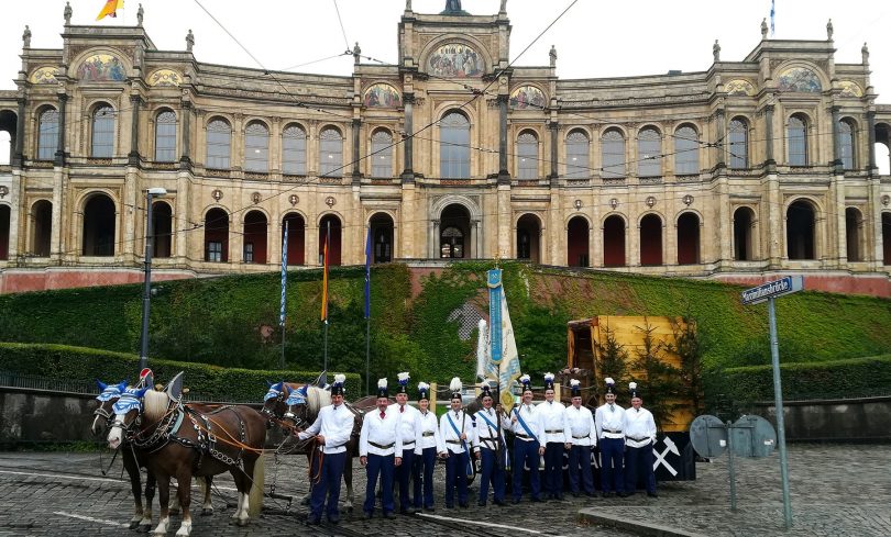 Die 185. Wiesn hat an diesem Wochenende gleich mit einem Höhepunkt begonnen. Am Sonntag fand der traditionelle Trachten- und Schützenzug durch München zur Münchener Theresienwiese statt. Über 9.000 Trachtler, Schützen, Fahnenschwinger, Volkstanzgruppen, aber auch Musikkapellen und Spielmannszüge bildeten zum  wiederholtem Mal einen der größten Trachtenzüge der Welt. Mit dabei die Bergknappen des Salzbergwerks Berchtesgaden, deren Zunft auf eine 400-jährige Tradition zurückblicken kann. Da kann mit Fug und Recht festgestellt werden, dass mit dem Münchner Volksfest und dem Salzbergwerk zwei große bayerische Traditionen zusammenkommen. Mehr noch, vor hunderten von Jahren war das Salz aus den Berchtesgadener Salzstollen eines der Grundstöcke für den Wohlstand Münchens. Der Stolz ist den Berglern bei Ihrer Fahrt durch die Landeshauptstadt ins Gesicht geschrieben. Stolz auf Ihre Geschichte und dabei sein zu dürfen, beim größten Volksfest der Welt. Vier Kaltblutpferde des Kaltblutzuchtvereins Berchtesgadener Land ziehen den festlich geschmückten Festwagen des Salzbergwerks. Vorneweg der Fähnrich mit Zunftfahne und den beiden Fahnenbegleitern. Vorne am Wagen liegt ein großer, 500 kg schwerer Salzstein, Dokument des seit 500 Jahren aktiven Salzabbaus in Berchtesgaden mitten in München.