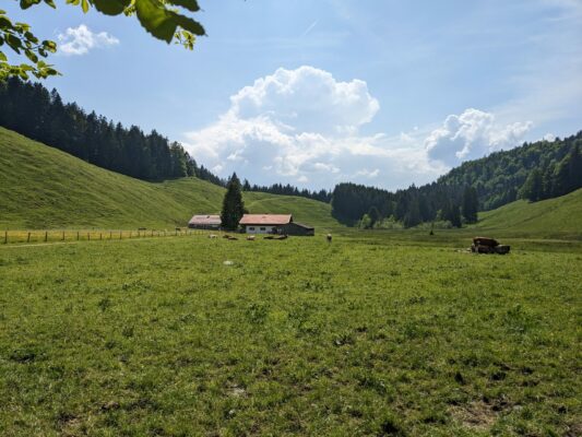 Es ist der erste Juni, herrliches Wetter, angenehme Temperaturen und wir wollen wandern. Wir planen eine gemütliche Almenwanderung am Samerberg und zwar zur Schwarzries, wo meine beiden Begleiter noch nie waren. Ich war vor ein paar Jahren auf der unterhalb des Spitzsteins liegenden wunderschönen Alm, aber die Schwarzrieshütte war damals geschlossen.