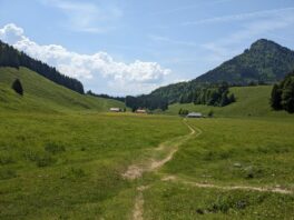 Die Almstraße endet jetzt und geht in einen schmalen Pfad über, der mehrere Biker auf E-Bikes oder MTBs nicht hindert, die Schwarzrieshütte anzusteuern. Wir überschreiten die Grenze zu Österreich, erkennbar an einem unscheinbaren Grenzstein. Der Weg geht leicht bergab, hinunter ins Trockenbachtal, dem nördlichsten Zipfel von Tirol. Erst zwischen der tirolerischen Unterwiesenalm und der bayerischen Oberwiesenalm im Tal zwischen Hochries und Klausenberg biegt die Grenze wieder nach Süden ab.
