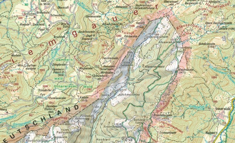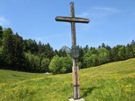 Wir starten beim Waldparkplatz Gammern in Bruchfeld (880 m) und wandern auf Almstraßen an der Wagneralm vorbei hinauf zur Käsalm (1015 m), Ausgangspunkt für eine Besteigung des unspektakulären, aber durchaus lohnenden Pastaukopfs (1325 m). Die Almwiesen leuchten in frischem Grün, die Kälber starren uns neugierig an, linkerhand steht oberhalb der Straßenböschung ein Kreuz. Wir klettern hinauf und lesen, daß es zur Erinnerung an die toten Bergkameraden der Alpenvereinssektion Mühldorf errichtet wurde. Wir passieren die Almhütte die nur sporadisch bewirtschaftet wird, heute gibt es hier nichts, aber es ist nicht mehr weit bis in die Schwarzries.