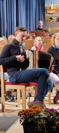 Ein Höhepunkt des Abends ist das Stück „Diatonika“ von Herbert Pixner – ein Solo für diatonische Harmonika und Blasorchester, gespielt vom Solisten Maxi Binder aus Brunn.