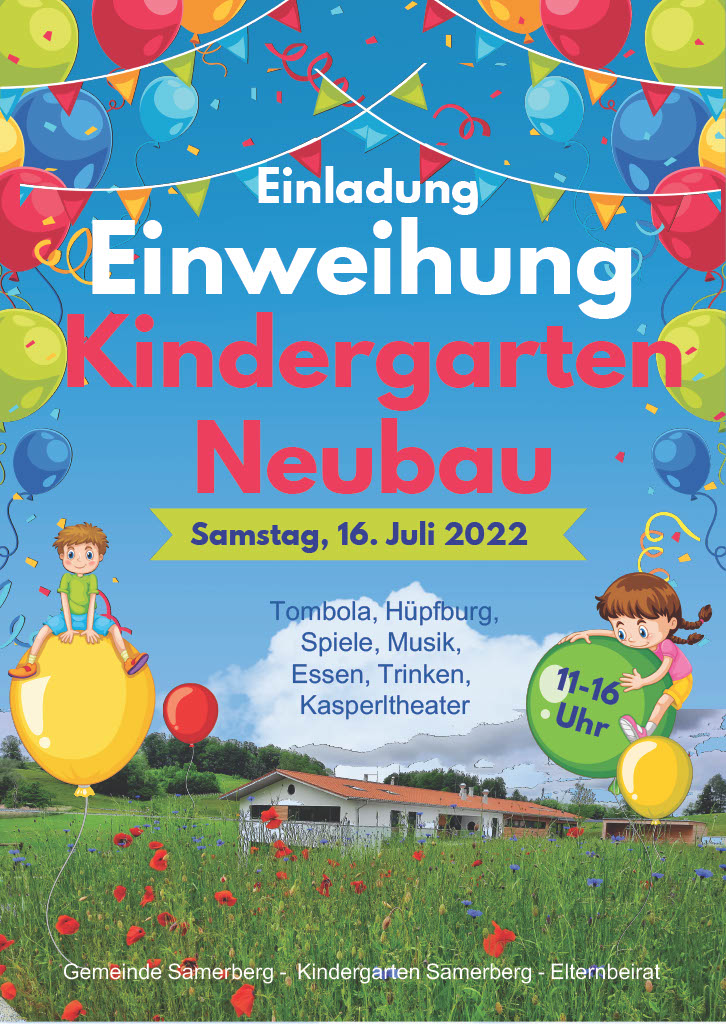 Buntes Programm für Jung und Alt am Samstag16. Juli von 11 bis 16 Uhr – Der Neubau des Samerberger Kindergartens ist beinahe zwei Jahre erfolgreich in Betrieb. Aufgrund der Corona-Beschränkungen musste aber bisher auf größere Einweihungsfeierlichkeiten verzichtet werden. Jetzt ist es aber soweit: am Samstag, den 16. Juli 2022 wird der neue Kindergarten feierlich eingeweiht.