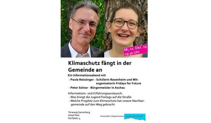 Referenten sind Paula Reissinger, die zum Organisationsteam von Fridays for Rosenheim gehört sowie Peter Solnar, Bürgermeister der Nachbargemeinde Aschau, der Aschauer Projekte zu diesem Thema vorstellen wird.