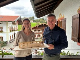 Bericht und Foto: Gemeinde Samerberg – Bürgermeister Georg Huber freut sich über das Ergebnis der Bachelor Arbeit von Rebecca Lehmann. Die Innenarchitektur-Studentin schuf auch ein Modell für ein nachhaltiges Campinggebäude.