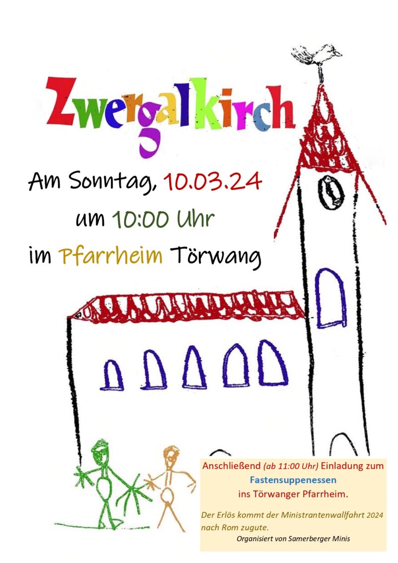 Beginn der Zwergalkirche ist um 10 Uhr im Törwanger Pfarrheim. Anschließend ab ca. 11 Uhr wird zum Fastensuppenessen im Pfarrheim eingeladen. Der Erlös davon kommt der Ministrantenwallfahrt 2024 nach Rom zugute, die von den Samerberger Minis organisiert wird.