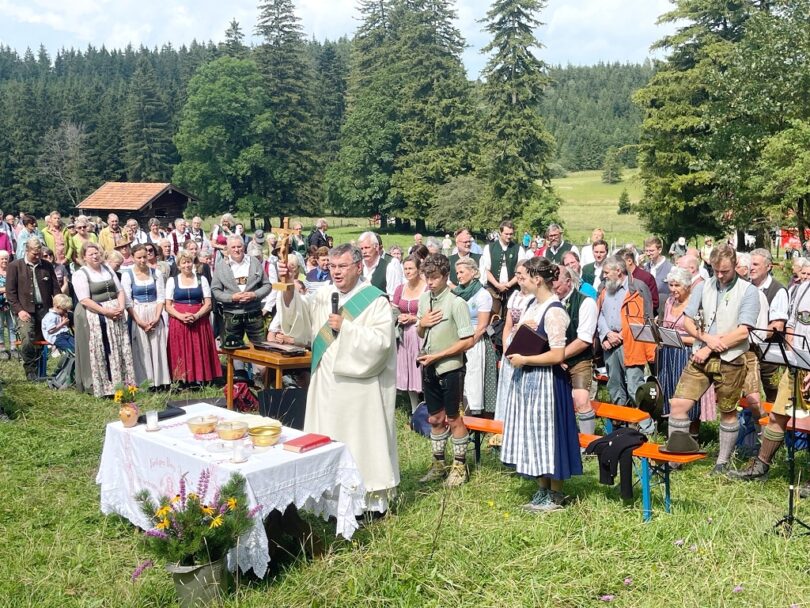 Den Auftakt bildete ein Berggottesdienst nahe der Zenznalm mit Diakon Günter Schmitzberger, der ganz frisch von der Ministrantenwallfahrt aus Rom zurückkam und der in seiner Predigtbotschaft die Wahrnehmung und Wertschätzung der Schöpfung Gottes im Alltag hervorhob. Die musikalische Gestaltung des Gottesdienstes übernahmen die Boarisch-Bries-Bläser, der Oberauer Viergesang aus Wildschönau, die Starnberger Fischerbuam, der Voglauer Sänger aus Siegsdorf, der Hamberger Viergesang, der Dreiwinkl-Gesang, die Sprittelsberger Zwoagesang aus Bad Kohlgrub sowie Rudi Ritter aus Schleching an der Zither. Guten Grund zum Dankesagen hatte Vorständin Ramona Sattlberger vom Grainbacher Trachtenverein. Alle Gruppen vom Gottesdienst und vom ganztägigen Alm-Zusammensein traten unentgeltlich auf, so dass auf einen Eintritt verzichtet werden konnte. Für die Auswahl und Organisation der Gruppen aus ganz Oberbayern kümmerten sich Monika Bauer und Ehrenvorstand Hans Sattlberger. Dieser lud zudem zum erstmals angebotenen offenen Jodeln und Singen beim Zenzn-Heustadl ein. Dort ließen sich die „Hochrieser“ mit Verstärkung sowie die Riadastoana-Jodlergruppe vom Tegernsee mit ihren Jodlern und Liedern hören und sie luden auch zum Mitsingen ein. Zusätzliche Musikanten und Gesangsgruppen waren nach dem Gottesdienst die Hubertus-Musikanten, der Buxbam-Zwoagesang, die Geschwister Bauer, der Karlinger Dreigesang, die Neukirchener Sängerinnen und die Starnberger Fischerbuam-Tanzlmusi, sie wechselten zwischen der Sigl-Alm und der Daxlberger-Hütte hin und her. Überall sorgten fleißige Hände für gute und almerische Bewirtung. Marianne Stuffer – eine der vielen aktiven Frauen – brachte soviel Teig mit, dass sie 300 Schmalz-Nudeln frisch aus dem heißen Fett herausholen und vor Ort anbieten konnte. „Dank der Sänger und Musikanten sowie der vielen Ehrenamtlichen und von Flötzingerbräu kam es zu einem echten Almgenuss, das Almsingen auf dem Moserboden war wieder ein ganz besonderes Erlebnis“ – so das Resümee am späten nachmittag von Vorständin Ramona Sattlberger.