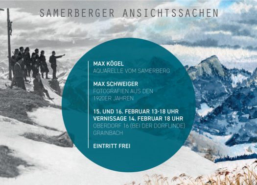 Seit jeher hat der Samerberg ein großes Suchtpotential. Das erkennt man nicht nur an den Feriengästen die seit Jahrzehnten ihren Urlaub hier verbringen. Auch Künstler aus dem nahen Rosenheim zieht es schon immer hinauf auf die ersten Gipfel der Bayerischen Alpen und dem einzigartigen Hochtal direkt vor ihrer Haustür. An einem Wochenende im Februar werden in Grainbach Fotografien und Aquarelle von zwei ganz unterschiedlichen Rosenheimern gezeigt. Beide aus Rosenheim, beide mit einer großen Leidenschaft für das Bergsteigen und die Samerberger Landschaft. Max Schweiger (1876-1957) fotografierte und dokumentierte das Erwachen des Bergsteigens auf der Hochries mit seinen schwarz-weiß Aufnahmen aus den 1920er Jahren. Max Kögel (geb 1938) fängt in seinen Aquarellen seit über 60 Jahren einfühlsam Landschaft und Wolkenstimmung am Samerberg ein. So sind berührende Werke zum Wiedererkennen entstanden. Die hohe maltechnische Qualität der Aquarelle und die Ästhetik der alten Fotografien aber machen das Betrachten zum Kunstgenuss. Zu sehen sind die Bilder am 15 und 16. Februar von 13-18 Uhr in Oberdorf 16 in Grainbach. Die Vernissage findet am Freitag 14.Februar um 18:00 statt. Der Eintritt ist frei.