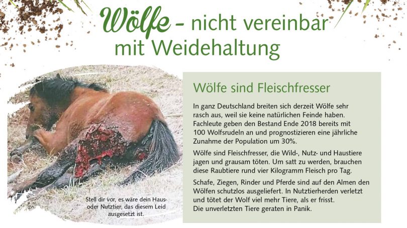 Wölfe sind Fleischfresser – In ganz Deutschland breiten sich derzeit Wölfe sehr rasch aus, weil sie keine natürlichen Feinde haben. Fachleute geben den Bestand Ende 2018 bereits mit 100 Wolfsrudeln an und prognostizieren eine jährliche Zunahme der Population um 30%. Wölfe sind Fleischfresser, die Wild-, Nutz- und Haustiere jagen und grausam töten. Um satt zu werden, brauchen diese Raubtiere rund vier Kilogramm Fleisch pro Tag. Schafe, Ziegen, Rinder und Pferde sind auf den Almen den Wölfen schutzlos ausgeliefert. In Nutztierherden verletzt und tötet der Wolf viel mehr Tiere als er frißt. Die unverletzten Tiere geraten in Panik.
