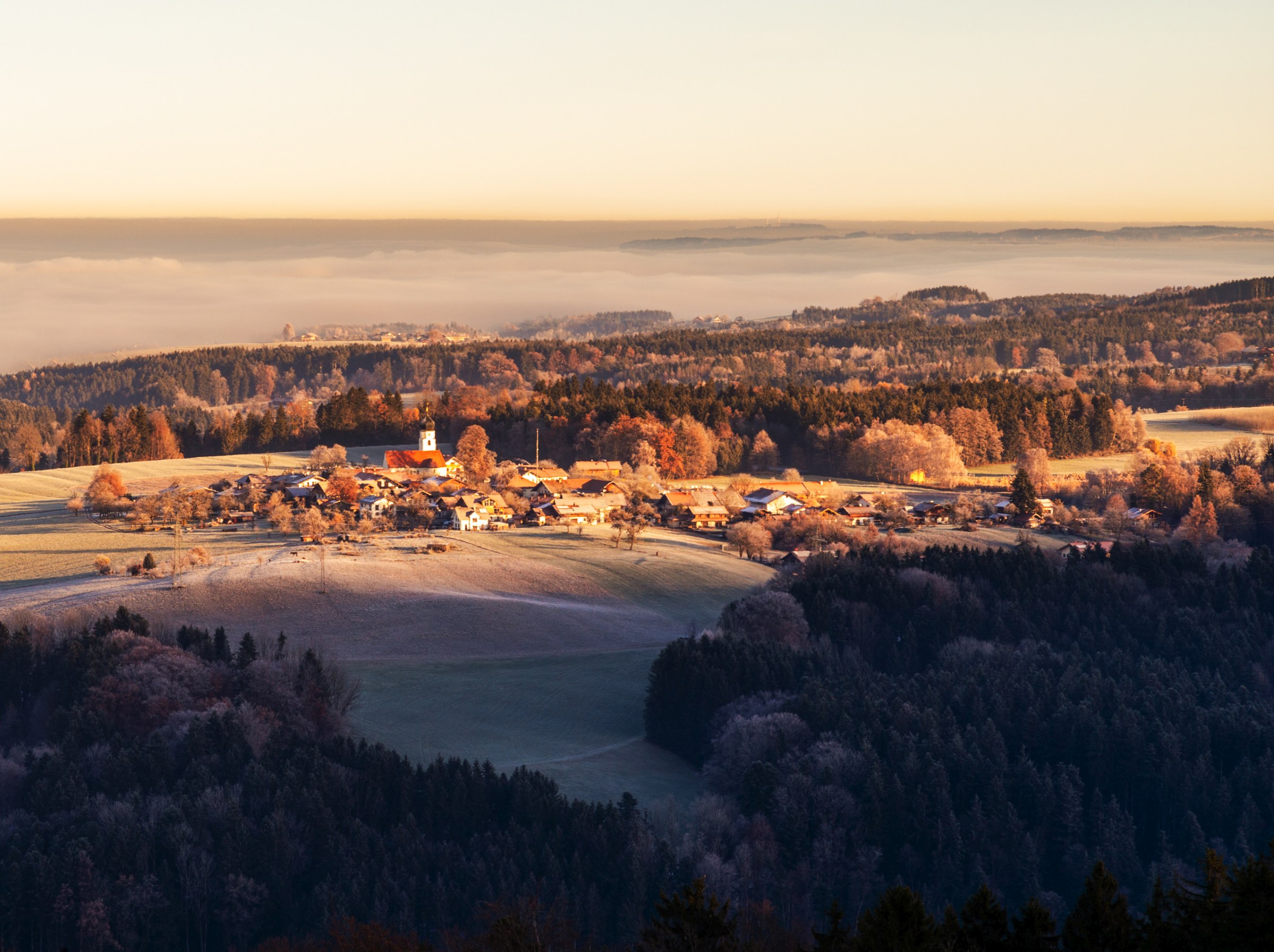 Blick vom Samerberg auf Höhenmoos bei Sonnenaufgang heute morgen. Der Nebel zieht langsam ab…