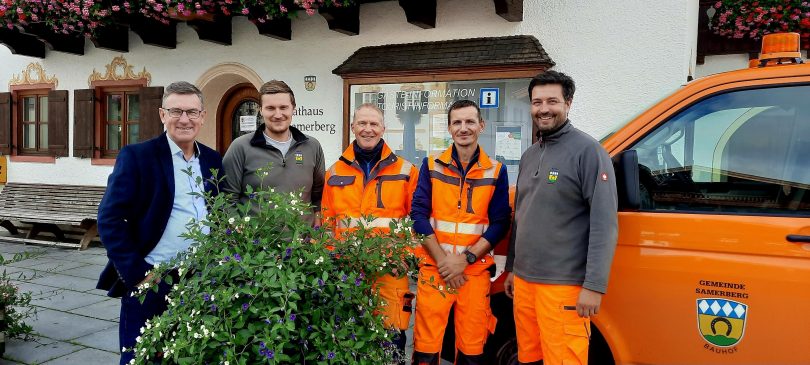 Gleich zwei personelle Neuzugänge verzeichnet der Bauhof der Gemeinde Samerberg. Am 1. Juli begann Steve Zabel (2. von rechts) den Dienst in der Gemeinde Samerberg, am 1. August folgte dann Werner Woog (Mitte). „Zusammen mit Florian Woog (2. von links) und Bauhof-Leiter Nico Altmann (rechts) haben wir jetzt wieder vier Mitarbeiter im Bauhof“, freute sich Bürgermeister Georg Huber über das neue schlagkräftige Team.Werner Woog (wohnhaft in Aschau) war zuletzt viele Jahre für landschaftsgärtnerischen Belange in der Nachbargemeinde Aschau / Chiemgau tätig. Steve Zabel kam von der BayWa auf den Samerberg und wohnt mit seiner Familie in Holzmann.