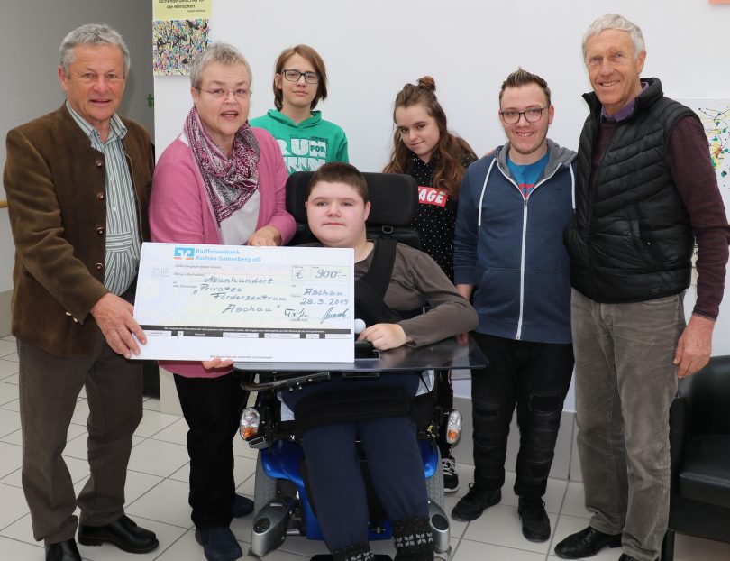 Erich Gawlik (links) und Xaver Stadler (rechts) brachten 900 Euro aus dem Erlös des Benefizkonzertes in der Pfarrkirche Mariä Himmelfahrt in Törwang ins Behandlungszentrum nach Aschau. Mitwirkende der volksmusikalischen Veranstaltung in der Pfarrkirche waren das Duo Stadler/Gawlik, die Schwarzensteiner Sängerinnen und das Laubensteiner Bläser Duo. Schulleiterin Susanne Kremer und die Kinder der Förderstufe im privaten Förderzentrum freuten sich über die Spende.