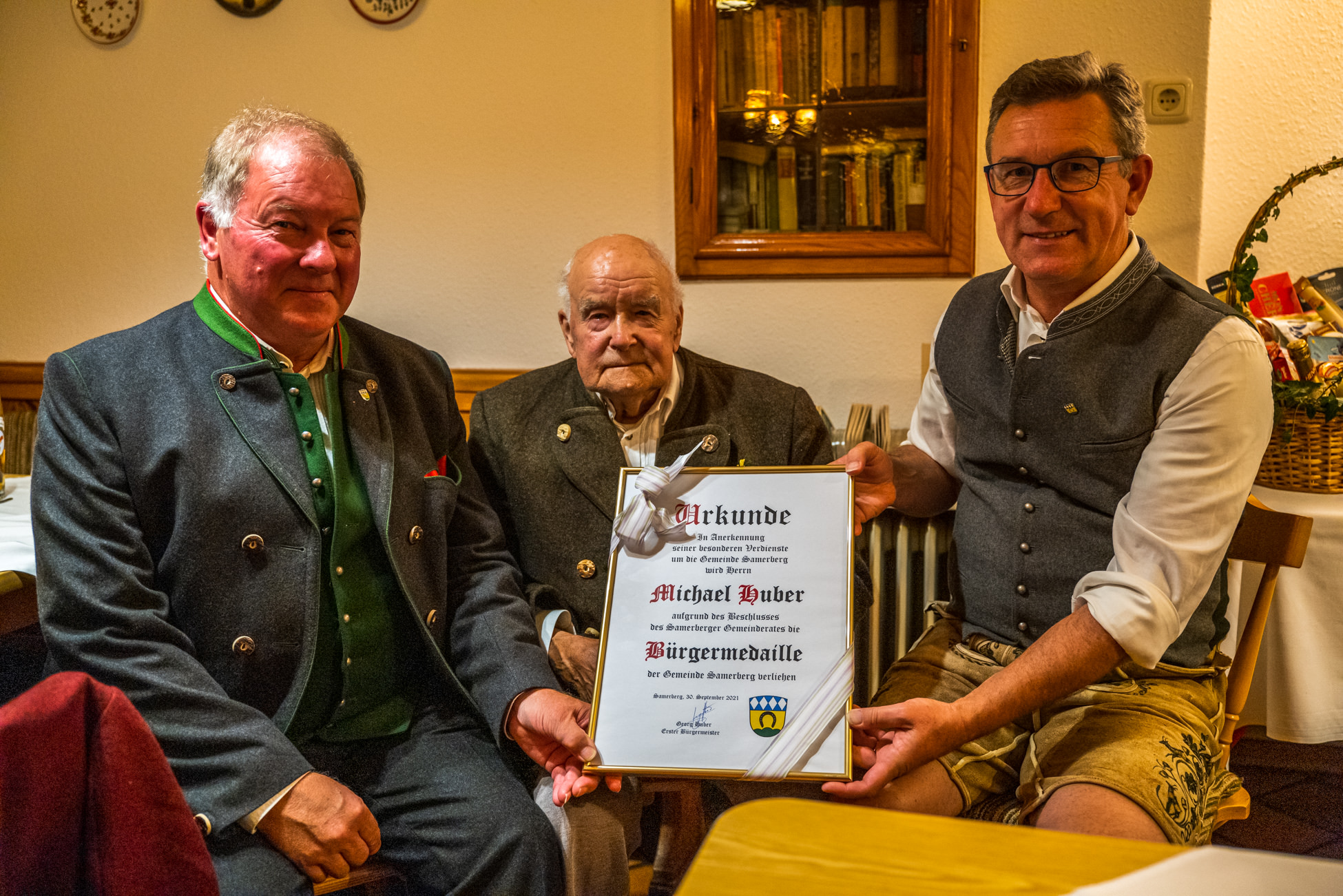 Michael Huber aus Obereck erhält die „Bürgermedaille“ der Gemeinde Samerberg an seinem 90. Geburtstag.