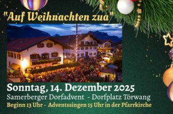 Auch heuer gibt es wieder einen Dorf-Advent auf dem Samerberg. Nach guter Tradition findet dieser am dritten Adventsonntag (14. Dezember) mit dem Titel „Auf Weihnachten zua“ statt. Der malerische Dorfplatz von Törwang zwischen Gasthof „Zur Post“ und Rathaus steht dabei ab 13 Uhr mit Verkaufsständen und Bewirtung im Mittelpunkt. Ein erstes Herzstück des Advent-Erlebnisses ist ab 15 Uhr in der Pfarrkirche „Mariä Himmelfahrt“ ein Adventsingen.