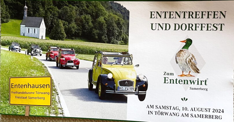 Das Stelldichein von 2CV -Enten und kulinarischen Entenliebhabern beginnt am vormittag mit der Ankunft auf der Entenwiese, es folgen das Mittags-Enten-Essen, eine Ausfahrt rund um den Samerberg und ab 17 Uhr ein gemütliches Dorffest.
