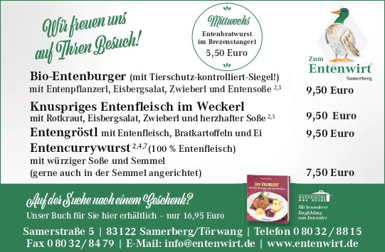 Der Samerberger Entenwirt bereichert den Markt dabei mit einer Auswahl an Spezialitäten rund um die Ente. Angeboten werden unter anderem ein Bio-Entenburger mit Entenpflanzerl, Eisbergsalat, Zwiebeln und Entensoße sowie knuspriges Entenfleisch im Weckerl mit Rotkraut, Salat, Zwiebeln und herzhafter Soße. Zudem stehen Entengröstl mit Bratkartoffeln und Ei sowie eine Entencurrywurst aus reinem Entenfleisch mit würziger Soße und Semmel zur Auswahl.