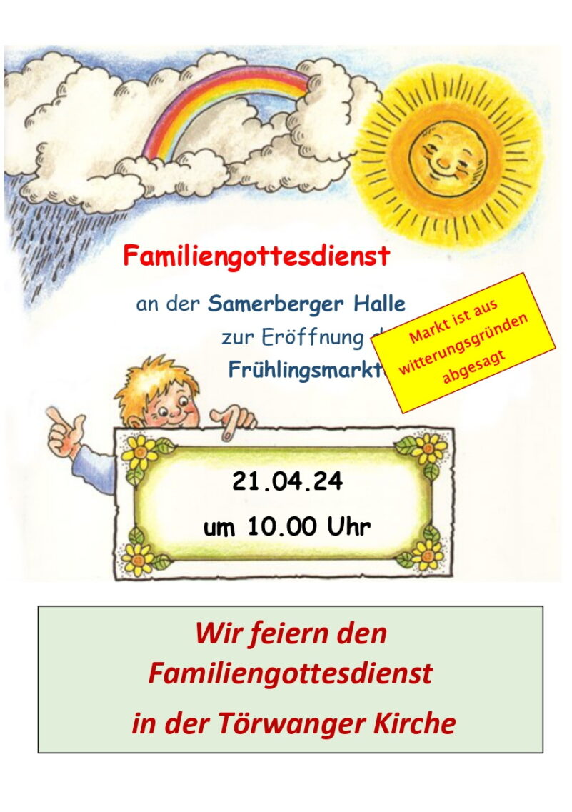 Der im Rahmen des Samerberger Frühlingsmarktes geplante Familien-Gottesdienst wird auch nach der wetterbedingten Markt-Absage stattfinden.