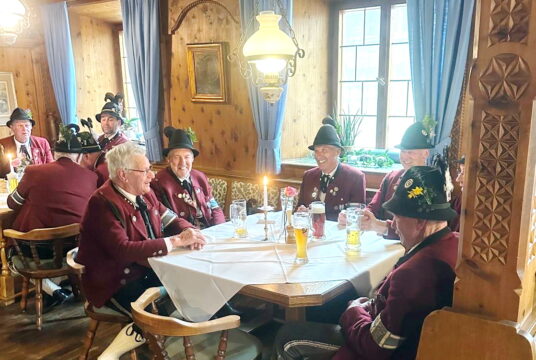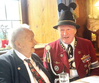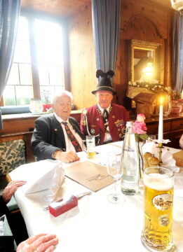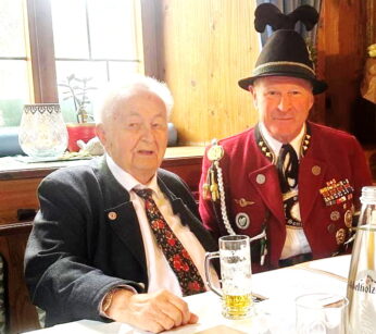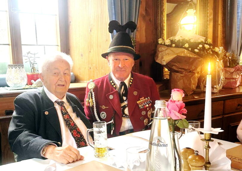 Bereits beim 80. Geburtstag gab die Gebirgsschützenkompanie für Dr. Hugo Lechleuthner einen Ehrensalut, damals erhielt er zudem die Goldene Ehrenmedaille der GSK Samerberg. Nunmehr freuten sich Hauptmann Fritz Dräxl und seine Kameraden, dass sie dem rüstigen Jubilar erneut gratulieren konnten. „Unser Hugo stand immer Gewehr bei Fuß und war zugunsten unserer Kompanie zur Stelle“ – so Hauptmann Dräxl bei der Feier im Gasthof „Zur Post“ in Törwang und überreichte mit einem kräftigen „Schützen-Heil“ einen kulinarisch gefüllten Geschenkkorb. Der Jubilar seinerseits bedankte sich bei der Abordnung der Samerberger Gebirgsschützen mit einer Einladung zum Mittagessen, mit Kaffee und Kuchen und mit einem geselligen Gedankenaustausch.