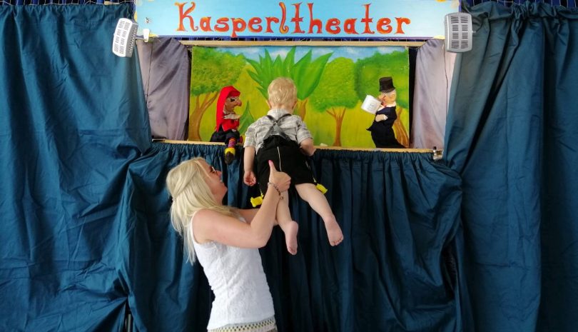 Fotos: 1. Eindrücke von den Chiemsee-Kasperl-Auftritten mit Bürgermeister Georg Huber auf dem Samerberg. 2. Oberkasperl Stephan Mikat mit Bürgermeister Georg Huber.