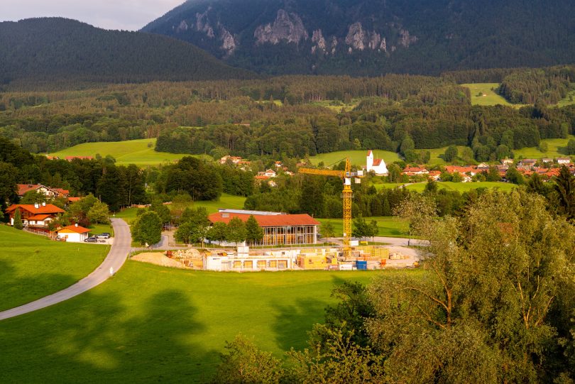 Im Licht der Abendsonne zeigen sich derzeit bei der größten Samerberger Baustelle zwei Gegebenheiten ganz besonders: einmal, dass der Neubau des Kindergartens zwischen Törwang und Grainbach gut vorankommt und zum zweiten, dass sich an diesem Platz inmitten des Hochplateaus die jungen Dirndl und Buam wohl richtig wohlfühlen werden.