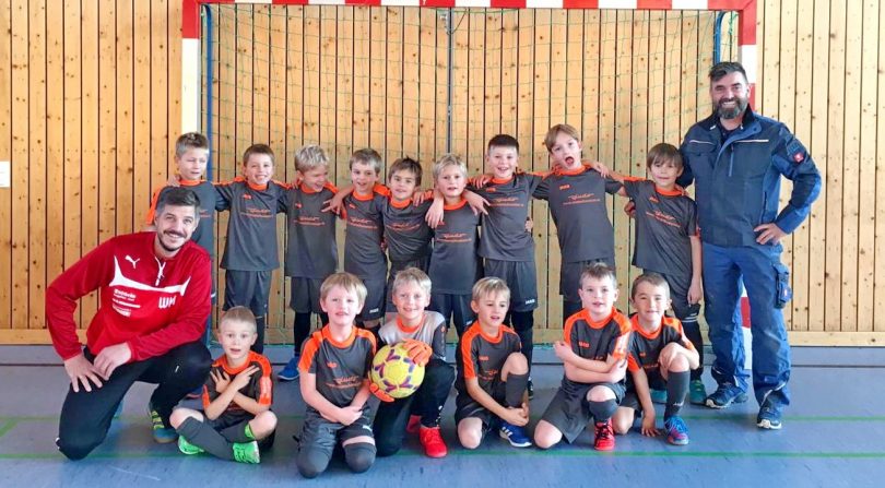Vorweihnachtliche Freude bei der G-Jugend des Wintersportvereins Samerberg. Die jungen Fußballer mit ihrem Trainer Markus Wallner (li.) haben einen neuen Satz Trikots erhalten. Sponsor ist Sebastian Stuffer (re.) mit seiner am Samerberg beheimateten Firma für Heizung und Sanitär. „Da macht Fußball-Spielen noch mehr Spaß“ – so die hoffnungsvollen Nachwuchs-Kicker vom Samerberg bei ihrem Foto-Termin.