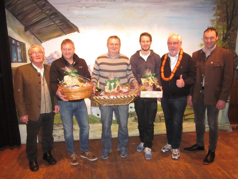 Text zum Foto von links nach rechts: Spielleiter Matthias Schwaiger, Die Punktgleichen Sieger Paul Moser und Paul Herold, Drittplazierter Martin Schiefer, Schneiderpreisgewinner Peter Steeg und Veteranenvorstand Michael Irger.