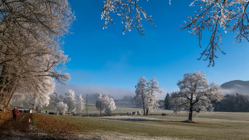 In besonderer Weise präsentiert sich bei bestimmten Vorgaben der Natur auch die Samerberger Filze mit ihren Bäumen, Sträuchern und Wiesen – in einem eigenen, weißen Kleid.