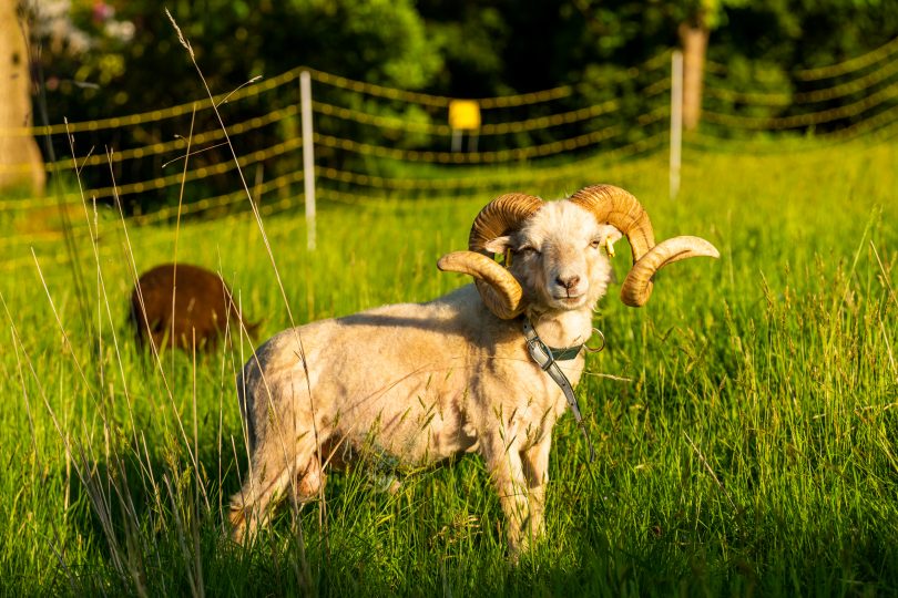 Ein stattliches und stolzes Exemplar eines Schafsbockes hat unser Fotograf im Ortsteil Untereck der Hochtalgemeinde Samerberg entdeckt. Das sanfte Grün der lichtdurchfluteten Weide macht ihn trotz seiner mächtigen und sonderbar geformten Hörner zu einem anscheinend friedlichen Zeitgenossen.