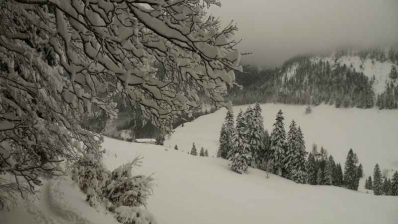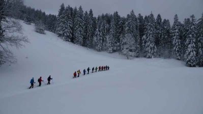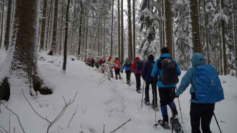Bereits ab dem Parkplatz Bruchfeldhaus konnte man auf einer durchgehenden Schneedecke durch den Wald hinauf seine eigene Spur ziehen. Tief verschneit waren rundherum die Bäume, so dass man unter dem einen oder anderen runter hängenden Ast unten durch musste. Ab der Wagneralm war dann alles in dickes Weiß gehüllt. Wenig Leute waren unterwegs und in der Wirtsstube der Schwarzrieshütte war die Gruppe Schneeschuhgeher fast alleine. Umso mehr freute sich der Wirt über den schneidigen Besuch. Den ganzen Weg über musste die Gruppe selber spuren. Das war zwar einerseits fordernd und anstrengend, aber andererseits ein tolles Erlebnis. Wann hat man im Chiemgau schon mal das Gefühl, man ist so einsam und wild unterwegs, wie in Alaska?