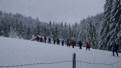 Am Sonntag führte die Schneeschuhführerin Josefine Lechner bei abenteuerlichen  Schneeverhältnissen eine Schneeschuhtour auf dem Samerberg zur Schwarzrieshütte.