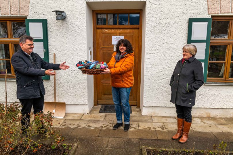 Eine lange Tradition hat auf dem Samerberg der Advent- und Weihnachts-Basar der Katholischen Frauengemeinschaft. Nachdem sich bereits im Sommer erahnen ließ, dass dieser Markt in der Samerberger Halle heuer wegen Corona nicht stattfinden kann, gab es aus den Reihen der Runde von Frauen, die sich regelmäßig zum Basteln, Stricken und Ideen Sammeln treffen, einen besonderen Vorschlag. Die fleißigen Strickerinnen schufen in individueller Heimarbeit warme und farbige Socken und diese wurden jetzt von Gisela Schober, der Vorsitzenden der Frauengemeinschaft und von Barbara Huber, der Initiatorin der Strick-Aktion an Diakon Günter Schmitzberger übergeben; dieser bedankte sich dabei mit den Worten: „Die Socken werde ich im Rahmen meiner Hausbesuche gut einsetzen können, denn gerade im kalten Winter und in der gefühls-kalten Corona-Zeit werden sie Füße und Herzen wärmen“. Und Gisela Schober fügte hinzu: „Mit dieser tollen Idee haben wir nicht nur neue Strickerinnen und Mitglieder für unsere Gemeinschaften gewonnen, sondern auch noch für den nächstjährigen Basar gleich einen guten Grundstock von Socken geschaffen“.