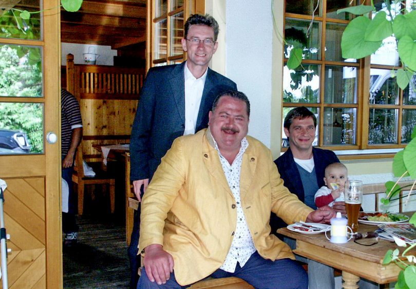 Foto: Erinnerung an Joseph Hannesschläger, eine Aufnahme im Jahr 2003 mit Bürgermeister Georg Huber bei einer Aufnahme im Biergarten von der Gaststätte Alpenrose in Grainbach