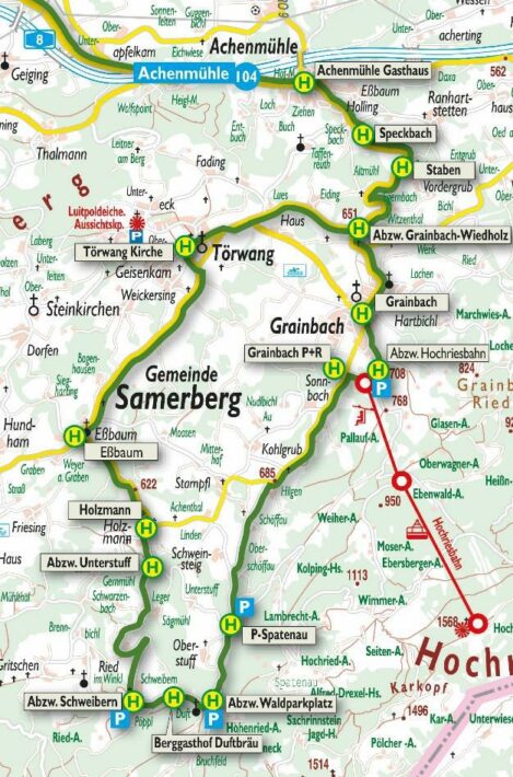 Die Linie Nr. 493 fährt morgens zweimal zu den beliebtesten Wanderparkplätzen auf dem Samerberg und bringt die Gäste am Nachmittag mit zwei Fahrzeitangeboten wieder zurück. So kann man zum Beispiel um 06.55 Uhr mit dem Zug in München starten, um kurz nach 08.00 Uhr am Wanderparkplatz Spatenau eine Hochriestour zu starten. Vom Gipfel hinab geht’s bequem mit der Hochriesbahn und wahlweise um 14.54 oder 16.54 Uhr wieder zum Bahnhof Rosenheim. Die passende Zugverbindung ab Rosenheim bringt die Fahrgäste in ca. 50 Minuten zum Bahnhof München zurück. Auch die Anbindung dieses ÖPNV-Angebotes für die Kurgäste aus Bad Feilnbach und Bad Aibling ist nach wie vor mit den Linien 343 und 342 gegeben.