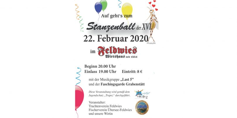 Am kommenden Samstag, den 22. Februar 2020, veranstaltet der Trachtenverein “Chiemgau” Feldwies zusammen mit dem Fischerverein Übersee-Feldwies im hiesigen Wirtshaus “D’ Feldwies” ihren nunmehr 16. Stanzenball. Für musikalische Unterhaltung sorgt die fünfköpfige Band “Last 5” aus Grabenstätt und Vachendorf. Des Weiteren gibt es einen Gastauftritt der Faschingsgarde aus Grabenstätt.
