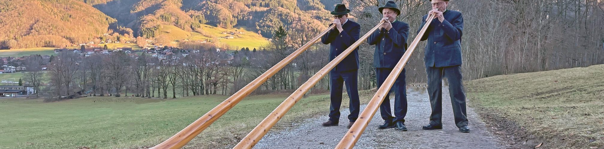 Beschaulicher Jahreswechsel in Aschau: Bei untergehender Sonne haben die Kirchenglocken der katholischen Pfarrkirche Darstellung des Herrn geläutet, dazu haben die drei Aschauer Alphornbläser begonnen vor dem Stadel vom Oberweidachjörg am Bankerlweg ihre besonderen Musikinstrumente erklingen zu lassen. Hans Bauer, Erich Gawlik und Anderl Pertl (von links) schenkten mit ihren Klängen viel Freude zum Jahreswechsel am Fuße der Kampenwand. Viele Bürger und Gäste sind gekommen um den Ständchen zu lauschen.
