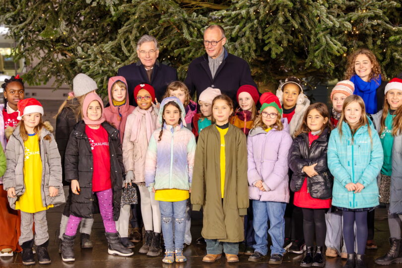 Bericht und Foto: AGDW / Runge -Präsident Prof. Andreas Bitter mit Bundeskanzler Friedrich Merz und dem Kinderchor Vokalhelden bei der Übergabe des Weihnachtsbaumes der Waldeigentümer im Ehrenhof des Bundeskanzleramtes.