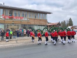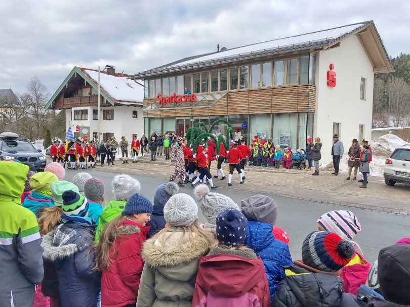 Dank einer Einladung der Sparkasse Rosenheim-Bad Aibling kamen die Schäfflertruppe und Musikanten aus Kolbermoor zu einem Auftritt nach Frasdorf. Der Auftritt vor dem Sparkassengebäude wurde mit Interesse verfolgt von allen Klassen und Lehrern der Grundschule, für einen geordneten Verkehr während des Auftritts sorgte die Feuerwehr Frasdorf. Abschließend bedankte sich namens aller Zuschauer Bürgermeisterin Marianne Steindlmüller bei den Gästen aus Kolbermoor mit ihrem Schäffler-Tanzmeister und Bürgermeister Peter Kloo an der Spitze für den farbenfrohen Auftritt.