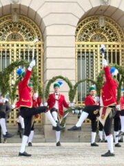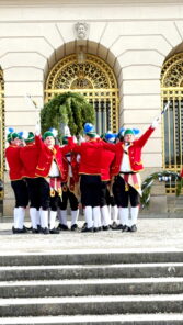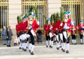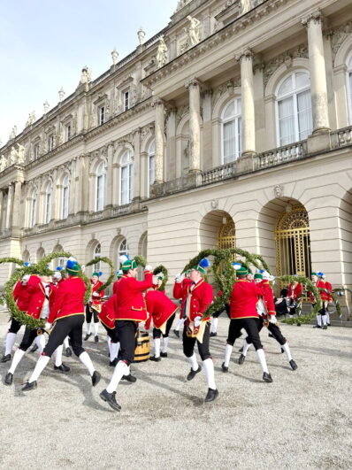 Fotos: Eindrücke von den Auftritten der Schäffler mit der Musikkapelle Kirchheim vor dem Königsschloss, u.a. Gruppenbild (dabei steht Vorstand Franz Sepp hinter dem Fass).