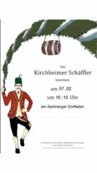 Die Schäfflerzunft Kirchheim e.V. ist bemüht, diesen schönen alten Brauch weiterhin zu pflegen und viele Menschen zu erfreuen. Am Samstag, 7. Februar 2026 um 16.15 Uhr besuchen die Kirchheimer Schäffler das Bergsteigerdorf Sachrang. Am Sachranger Dorfladen treten die Schäffler auf und freuen sich auf viele Zuschauer. Für das leibliche Wohl ist bestens gesorgt. Weitere Infos gibt es bei der Tourist Info Sachrang, Tel. 08057/909737.